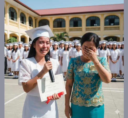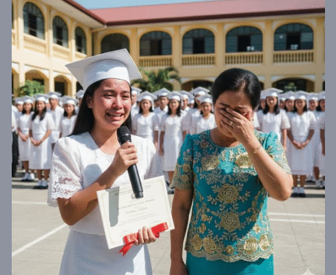 Mula sa huling hanay ng mga upuan, nakaupo ang kanyang ina — marungis, may bahid ng grasa sa braso, ngunit nakangiti nang buong puso.