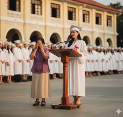Mula sa huling hanay ng mga upuan, nakaupo ang kanyang ina — marungis, may bahid ng grasa sa braso, ngunit nakangiti nang buong puso.